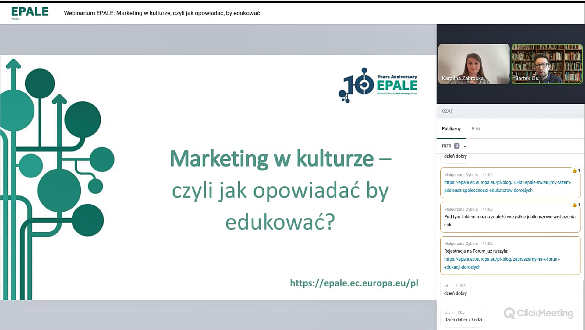 Webinarium EPALE z ekspertką od marketingu w kulturze było nie tylko okazją do rozmowy o narzędziach promocyjnych, lecz także przestrzenią do refleksji nad edukacją dorosłych. Spotkanie poprowadzili dr Barek Lis – socjolog, badacz społeczny, animator kultury, edukator, kierownik Działu Badań i Rozwoju w Instytucie Kultury Miejskiej w Gdańsku i Ambasador EPALE oraz Karolina Zabrocka - specjalistka komunikacji i marketingu w Instytucie Kultury Miejskiej w Gdańsku.
