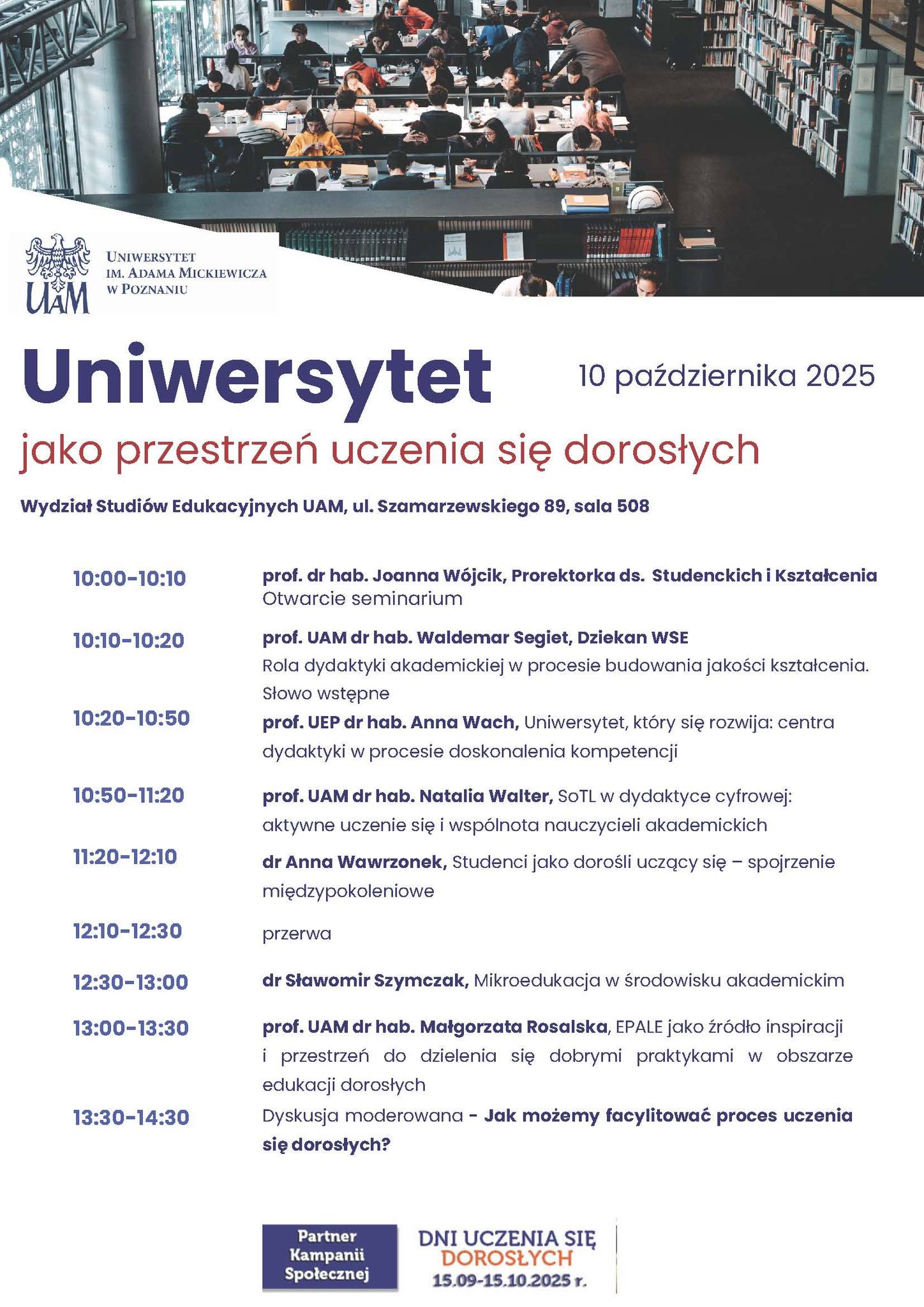 10 października 2025 roku na Wydziale Studiów Edukacyjnych Uniwersytetu im. Adama Mickiewicza w Poznaniu odbyło się seminarium „Uniwersytet jako przestrzeń uczenia się dorosłych”, organizowane w ramach kampanii Dni Uczenia się Dorosłych 2025. Wydarzenie miało na celu refleksję nad rolą uczelni wyższej jako miejsca uczenia się dorosłych. W programie znalazły się wystąpienia prorektor UAM. prof. Joanny Wójcik, prof. Waldemara Segieta, prof. Anny Wach, prof. Natalii Walter, dr Anny Wawrzonek, dr Sławomira Szymczaka oraz prof. Małgorzaty Rosalskiej. Omawiane były tematy związane z dydaktyką akademicką, aktywnym uczeniem się, edukacją cyfrową oraz mikroedukacją w środowisku akademickim. Seminarium zakończyła dyskusja dotycząca możliwości facylitowania uczenia się dorosłych. W seminarium wzięły udział 42 osoby (pracownicy UAM oraz studenci specjalności doradztwo zawodowe i edukacja karierowa).