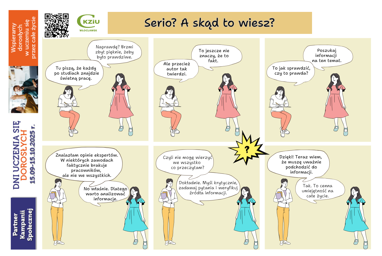 Tematem spotkania było „Krytyczne myślenie w praktyce”. Rozmawialiśmy o tym czym jest krytyczne myślenie, jak je rozwijać na co dzień, jakie korzyści płyną z refleksyjnego podejścia do informacji i podejmowania decyzji, jakie bariery mogą utrudniać krytyczne myślenie — m.in. emocje, stereotypy, presja grupy czy brak rzetelnych źródeł informacji.