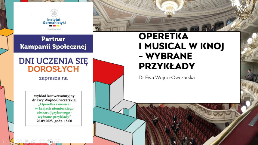 W dniu 26. września 2025 r. w ramach akcji Dni uczenia się Dorosłych odbył się w godzinach 18-19 w trybie zdalnym wykład konwersatoryjny pani doktor Ewy Wojno-Owczarskiej pt. Operetka i musical w krajach niemieckiego obszaru językowego – wybrane przykłady (wydarzenie pod patronatem Instytutu Germanistyki UW).